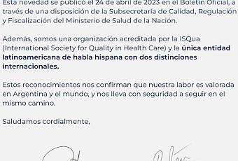 Por Disposición 9/2023 de la Subsecretaria de Calidad, Regulación y Fiscalización del Ministerio de Salud de la Nación, el ITAES se incorpora al Sistema Nacional de Evaluación de Calidad en Salud.