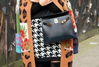 Con pied de poule. En falda corta, sweater negro y maxi cardigan. ¿El detalle? Su Kelly, de Hermès. O con falda y top en igual estampa.