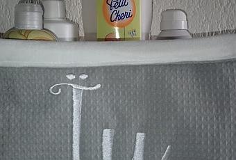 Hoy os traigo una cestita hecha con tela wafle gris, con forrito polar y dentro... una rafia plástica para dos cosas, para darle cuerpo y para que si algo se derrama no traspase ni estropeé el mueble.