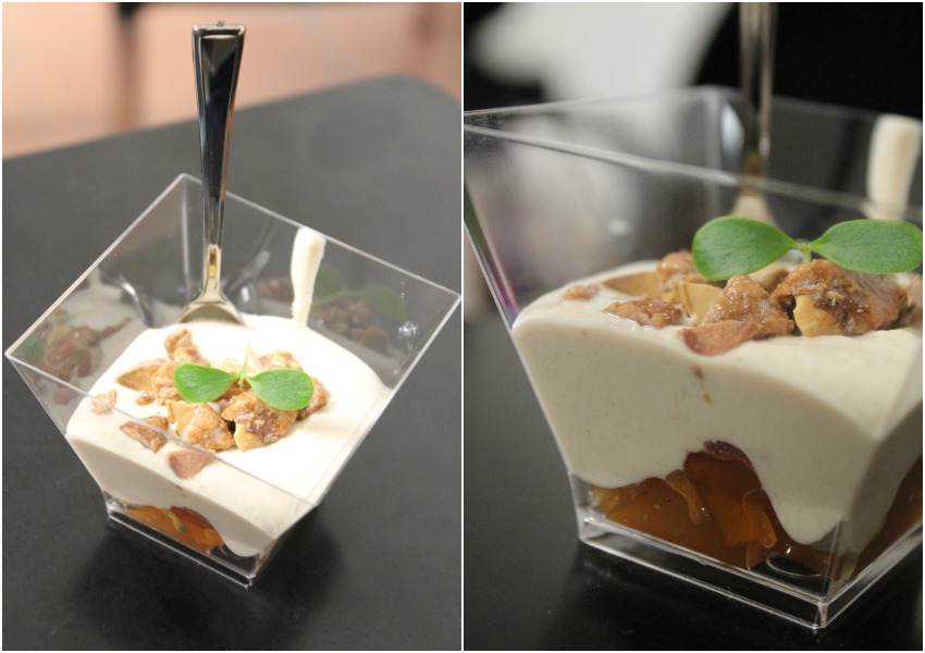 Mientras esperábamos que nos llamasen para nuestra sesión de cocina podías comprar tapas (una de salmón, otra de sobrasada y huevo de codorniz frito, y la ultima de lechona y foie), todas muy buenas, para amenizar el estómago en la espera.Empezamos la ruta con Igor del restaurante Ummo que nos preparó un "Yogur de foie, mermelada de calabaza y manzana y almendras garrapiñadas". Una combinación de sabores muy buena.