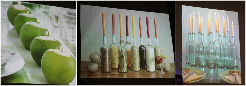 Y como centros de mesa originales mis favoritos son estos tres. Manzanas como soportes de velas, botellas de cristal vacías como candelabro o decoradas en su interior con semillas o lo que prefieras.