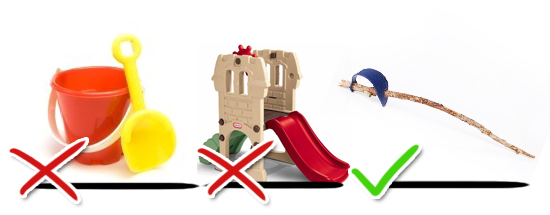 - Y mención aparte merecen los juguetes para el parque: cubos, palas, rastrillos, pelotas... He visto incluso una especie de embudo con un molino debajo que al pasar la arena hace que gire el molino. Sólo le falta producir energía eléctrica al dichoso artefacto. Olvidaos de todo eso... vuestro hijo sólo querrá utilizar elementos naturales que puedan servir como arma arrojadiza: palos puntiagudos, piedras, trozos de botella, latas... es gratis!