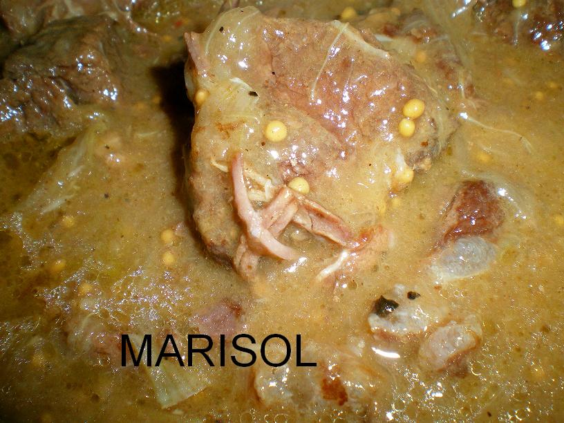En una cazuela ponemos la carne, troceada , cuando este dorada y el jugo consumido añadimos la cebolla, y mas tarde la zanahoria, echamos el vino, y dejamos que se evapore el alcohol y ponemos el laurel, la pimienta y la mostaza en grano.