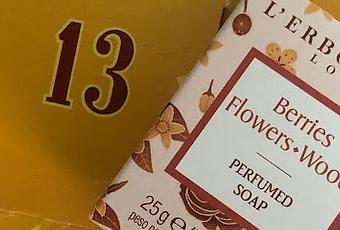 Abrimos ventana 13 y nos encontramos con un jabón perfumado (hay 3 jabones en el Calendario dell'avvento L'erbolario, dos perfumados y un champú.