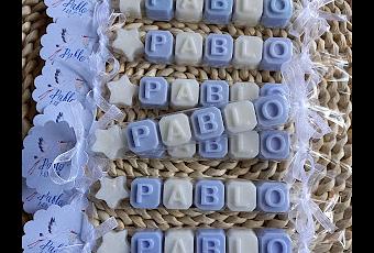 Los nombres en letras de jabón para el bautizo de Pablo, fueron realizados en una bonita y fina combinación de 2 colores que, dieron como resultado final un detalle muy especial con el que sus papás agradecieron a sus invitados la asistencia a su evento.
