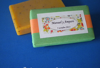 Se decidió el jabón, las dimensiones y el envoltorio, y en total han sido 200 mini-jabones felices para las invitadas a su boda. Para ellos, una botella de vino de naranja del Condado de Huelva.El jabón elegido fue el exfoliante de naranja, una variante del exfoliante de cítricos que ya hago, que contiene leche de cabra, zumo de naranja, avena molida, aceite de oliva virgen, coco, almendras dulces, palma, cera de abeja, semillas de amapola y aceites esenciales de naranja dulce y limón.El resultado es un jabón espumoso, hidratante, exfoliante y con aroma a cítricos.No sé si le ha pasado también a alguna jabonera, eso de estar de invitada en una boda donde se van a regalar sus propios jabones, así que yo estaba un poco de los nervios, lo más importante para mí es que los novios quedaron contentos.