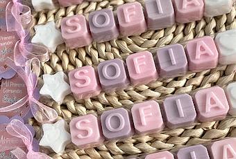 Para la comunión de Sofía preparé unos bonitos nombres en letras de jabón tonos lila, rosa y figuras en blanco.El formato de acabado fue caramelo y el aroma escogido por Sofía fue chocolate, dulce y exquisita que no pasa desapercibida, a mi me encanta!!. Las bonitas etiquetas dan como siempre el toque final a unos detalles personalizados que gustaron mucho tanto a su protagonista, a su mamá, como a las invitadas.En mi Instagram tenéis un reel con parte del proceso, como sabéis es un proceso que se realizada a mano cuidando al máximo tanto su elaboración como su empaquetado, decoración y personalización.
