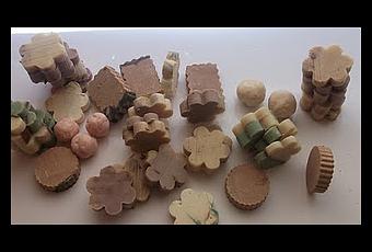 De otra manera tendría que deshacerme de ellos y la verdad me da pena. Para adornar una bolsa cojo uno de estos jabones le hago dos agujeros y le paso rafia por ellos y lo ato como si fuera un botón y la verdad quedan muy bonitos en las bolsas.