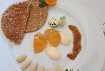 Ya dispuesta la jalea, podemos utilizarla como más nos guste. Hay quien la tomaría a cucharadas como mi padre hacía con la jalea de membrillo y hay quien puede sacarle partido en preparaciones más sofisticadas en salado o repostería. Os dejo un ejemplo con este plato en donde he utilizado cebolla confitada, queso crema holandés, queso Bergader y unas almendras sin piel. Pienso que iría muy bien con foie-gras de oca o pato y en general con fiambres de caza. Sin duda la estrella la pone la jalea con su delicado toque a pétalos frescos de rosa.