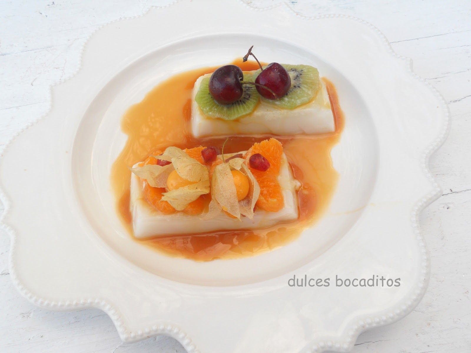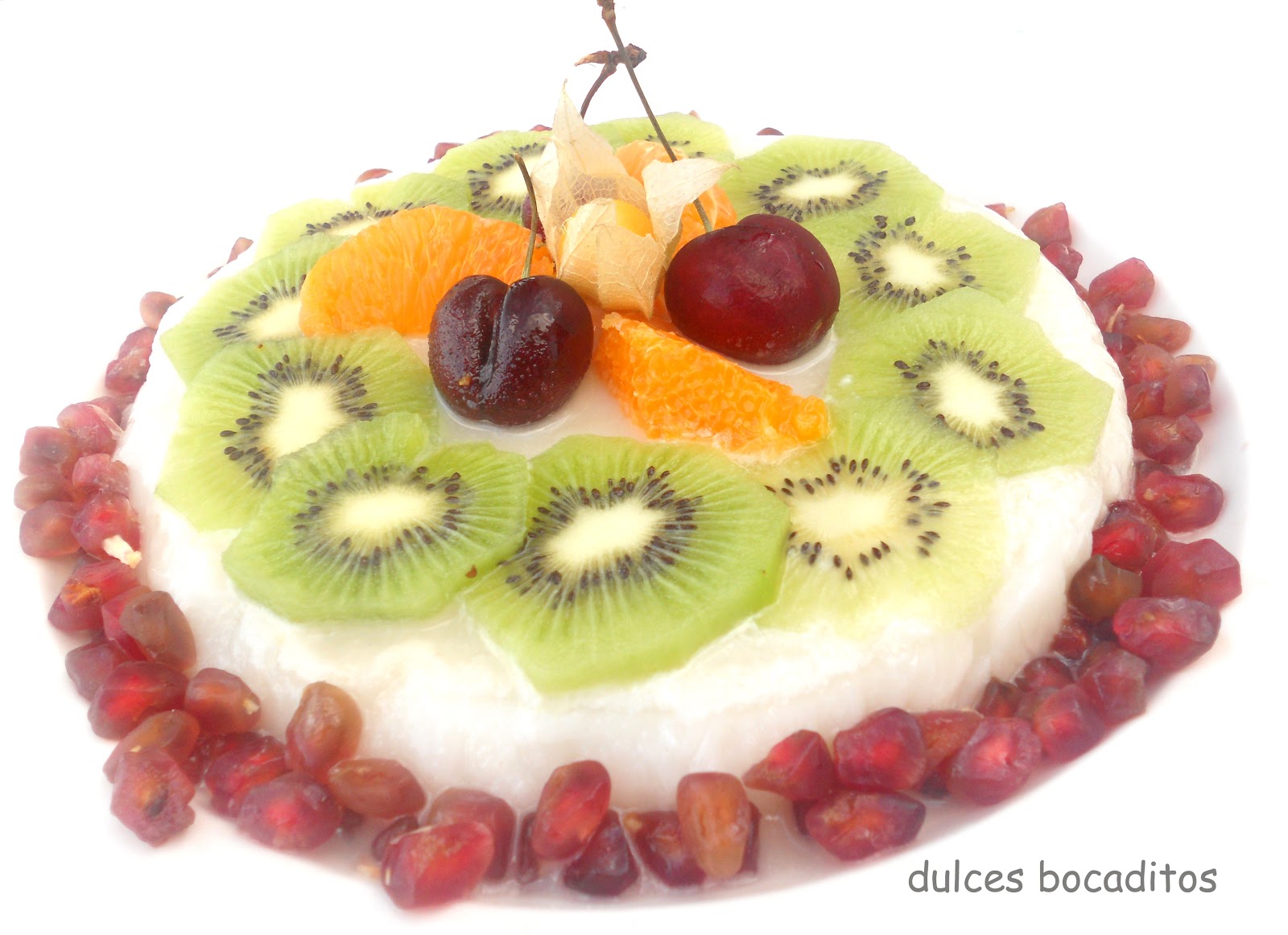 Desmolda con cuidado la jalea y córtala en 4 rectángulos,disponlos en platos y coloca sobre ellos la fruta cortada y unos granos de granada y cerezas.