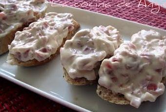 - Picar finito jamón serrano de calidad y reservar. Preparar una mayonesa con 1 huevo, un chorrito de zumo de limón y aceite (sin sal), que no quede demasiado espesa. Añadir al vaso de la mayonesa queso de untar (la mitad en peso que de mayonesa) y seguir batiendo hasta conseguir una mezcla homogénea. Mezclar con el jamón picado formando una masa uniforme. Tostar el pan y extender el jamon batido.