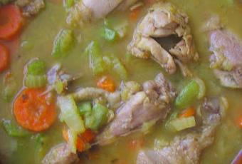 INGREDIENTES PARA 2-3 PERSONAS: 6 jamoncitos de pollo, 2 zanahorias, 1 cebolleta, 1/2 puerro, 1 vara de apio, 1 bubango o calabacín pequeño, 1 hoja de laurel, sal gorda, estragón, orégano, colorante y 1 botellín de cerveza sin alcohol o con (según prefieran o puedan).
