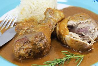 5- Sacar el pollo a una cazuela, quitar la mariposa y retirar el laurel. Triturar la salsa 30 seg. vel.8. Volcar sobre el pollo y dar un hervor destapado para reducir un poco la salsa.