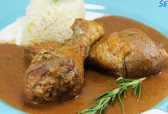 4- Sacar el pollo y laurel y triturar la salsa. Devolver el pollo a la cubeta y dar un pequeño hervor en guiso.