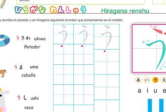 Repasa y escribe el caracter u en hiragana siguiendo el orden que presentamos en el modelo.