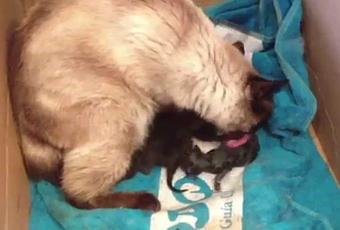 El 31 de marzo de 2013, por la tarde, empezó a pasearse inquieta por la casa. Me seguía a todas partes y maullaba. “Mamá, creo que esta gata va a parir hoy”. Por la noche, me llevó hasta el “nido” que yo le había preparado en un lugar escondido, y con poca luz. Cuando me alejaba, maullaba reclamando mi vuelta y nuevas caricias. Tuvo a su primer gatito a las 12 de la noche.