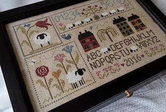 Tengo que reconocer que cuando vi este motivo de punto de cruz en el stand de Jardín Privé, en la feria "La Aiguille en fete" de París, me enamoré de él ya que tiene todos los ingredientes que me gustan: casitas, números, ovejas, flores....