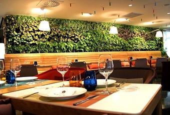 La pared vegetal cumple la función de proporcionar un espacio fresco en la zona central del restaurante sobre un banco corrido, en uno de los extremos la pared desciende en una rampa inclinada hasta el suelo. Es curioso como los clientes prefieren las mesas situadas bajo el jardín vertical frente a las del resto del restaurante.
