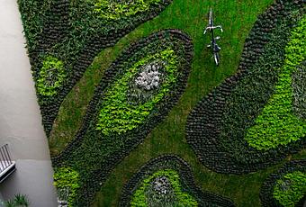 Es uno de nuestros jardines verticales en México favoritos. Este muro verde de unos 180 m2 se localiza en el patio interior de un restaurante del casco histórico de México D.F., en un viejo palacio virreinal. La novedad de utilizar una bicicleta como elemento decorativo, aporta la sensación de encontrarnos frente a un plano vertical transitable.