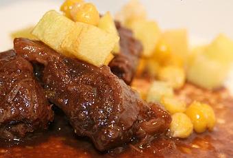 Ingredientes: 1.200 gr. de Jarrete o morcillo 2 Cebollas medianas o 1 grande 20 gr. de chocolate negro 100 ml de brandy 100 ml de vino blanco 1 litro de caldo de carne 2 hojas de laurel sal, pimienta, nuez moscada romero, tomillo Aceite de oliva V. Picada: Pan frito (2 tostadas ) 12 almendras tostadas 6 avellanas 2 dientes de ajo