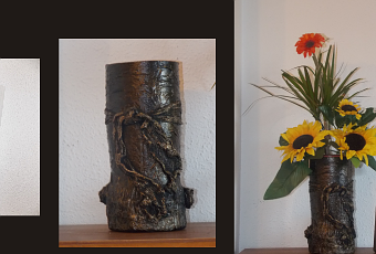 PASO 2: Ahora preparamos un poco de cola con agua en un recipiente y vamos cubriendo toda la superficie de la botella. Con una capa es más que suficiente.También cortaremos un trozo de gaza o venda, el cual sumergiréis en la mezcla de agua y cola y la colocaremos para hacer un detalle a nuestro jarrón.Nosotras hicimos un lazo y a los lados como unas rositas enrollando la gasa sobre sí misma.La base de la botella la haremos después que esté seca.PASO 3: Ya tenemos seca la capa que hemos dado ahora nos ocuparemos de hacer la base para darle mayor estabilidad. Para ello necesitaremos una hoja de periódico plegada de un ancho que nos permita ocultar el fondo de la botella.La colocamos rodeando la botella de manera que quede bien apoyada y la sujetamos con cinta de carrocero.PASO 4: Con el cartón haremos una circunferencia utilizando la botella y después de cortar lo pegamos con un poco de cola y terminamos de sujetar con cinta.PASO 5: Cubrimos la base con la preparación de cola y el papel higiénico y dejamos secar bien.PASO 6: Daremos una base de color a nuestro jarrón, para ello usaremos la pintura en spray. pintaremos por fuera y por dentro para que quede más bonito.PASO 7: Nuestro último paso será realzar los detalles de nuestro jarrón para lo cual usaremos la pintura acrílica dorada.Primero daremos una impresión a todo el jarrón con la ayuda de una esponja. Esto hará que de un todo a toda la botella pero no muy cargado, da un aspecto envejecido. Para destacar los detalles usaremos esta misma pintura pero usaremos un pincel.Y eso es todo amigos, ahora a buscar unas lindas flores, y a presumir de jarrón jejejeje