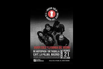 La noche del 21/12 en Madrid se presentará en directo el disco de Javier Sólo; un disco donde el músico de Terrassa no solo se crece, nos aporta un nuevo sonido marca de la casa con varios amigos que se refuerza con La banda del vecino; la formación que arropa a este músico y que esa noche vivirá en Café la Palma todo lo necesario para sorprender. Show de presentación por todo lo alto.