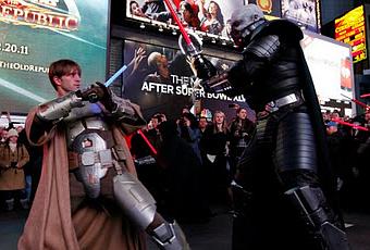 Para marcar el lanzamiento del nuevo sensacional video juego de Starwars, considerado por algunos uno de los mas caros de la historia por el costo de produccion que ha tenido, se convoco a un flash mob de Jedis y Siths, armados todos con sus sables de luz, marcaron el comienzo de las ventas oficiales de este juego.