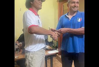 Jeigoth recibiendo el premio del anfitrión Edwin Vega y miembro del Comité Organizador del torneo.