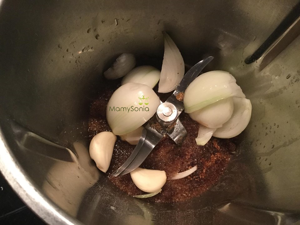 Precalentamos el horno a 200ºCEn primer lugar trituramos todas las escpecias junto con la cebolla , los ajos y el azúcar moreno podemos hacerlos en un molinillo, batidora o en la Thermomix 10 Seg, Vel 6