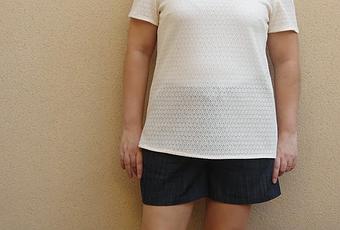 El patron es muy basico de corte recto , pinzas en el pecho, manga montada y cuello redondo.