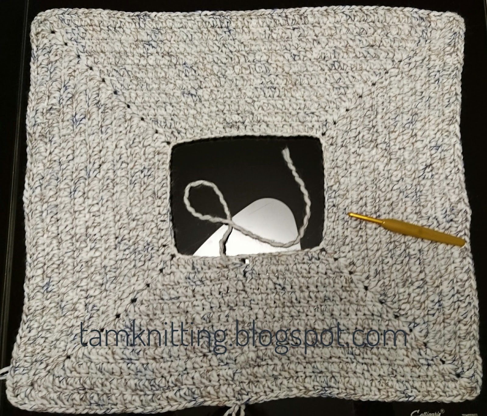 Seguimos tejiendo según el esquema y lo vamos probando hasta que lleguemos al ancho de pecho que necesitamos. Para eso, doblamos el cuadrado a la mitad y lo introducimos por la cabeza.