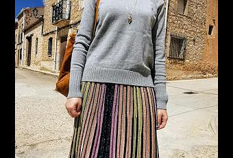 La falda es de Bimba y Lola, mochila-bolso de Malababa, anillo circular de María Torné y pendientes Órbita y colgante Copérnico de Fauna y Flora