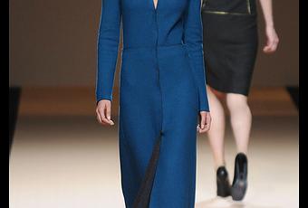 La actitud recatada que envuelve la propuesta también admite una serie de power looks y power dresses en gris piedra muy apropiados para interminables jornadas de asfalto. Los vestidos de noche trascienden acompañados de wraps tecnológicos de estilo industrial y faldas largas de corte sirena. Vía