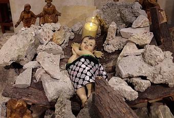 En la nave de la histórica Iglesia Evangélica Luterana de la Natividad de Belén se armó un pesebre en el que el niño Jesús, arropado con una kefia o tradicional pañuelo palestino, reposa sobre una pila de escombros. La iglesia luterana llamó a su sermón de Navidad “Jesús entre los escombros: una liturgia de lamento”. El reverendo Munther Issac, pastor de la iglesia, comenzó así su sermón: