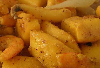 En una sartén echar un buen chorreón de aceite de oliva virgen extra (estoy usando en estos días de Riogordo, malagueño) y freir quince o veinte almendras (con su piel), tres dientes de ajo procurando que no se lleguen a quemar, sacarlos y reservarlos.En el mismo aceite sofreír un pedazo de cebolla cortada en trocitos, salándola previamente con cuidado de que no se queme, agregar una rebanada de pan cateto (pan de pueblo, aunque puede servir cualquier otro, Coín aún amasan a mano); cuando esté doradito volver a incorporar las almendras y los ajos, un vaso de vino blanco, un vaso de agua y pasar por la minipimer de forma que quede lo más fino posible.Cortar la jibia en trozos (limpiarla se le puede pedir al pescadero), pelar los langostinos y cortar la cebolla en trozos pequeños.En una cacerolita echar un chorreoncito de aceite de oliva (ya saben, malagueño a ser posible) y sofreír la jibia y los langostinos.Añadir cuatro o cinco granos de pimienta negra, dos hojas de laurel, salar al gusto, la salsa del almendra, azafrán (en su defecto colorante alimentario) y llevar a ebullición a fuego lento.
