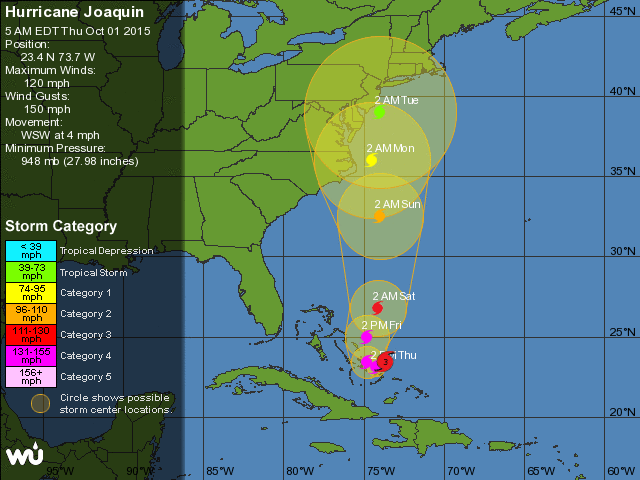 Lo más importante para destacar es que "Joaquín" podría seguir aumentando su fuerza en las siguientes 24 a 48 hs, con un movimiento que lentamente irá girando hacia el Nor - Noroeste hacia la noche del día jueves 1 o durante el viernes 2, según ha informado El Centro Nacional de Huracanes con sede en Miami.Otra información importante para mencionar es que el centro del fenómeno natural se moverá muy cerca de las Islas Bahamas en las siguientes 24 a 48 hs, provocando lluvias torrenciales con posibles inundaciones repentinas, intensos vientos y peligroso oleaje. "Joaquín" podría alcanzar la categoría 4 entre los días jueves 1 de octubre y el viernes 2.
