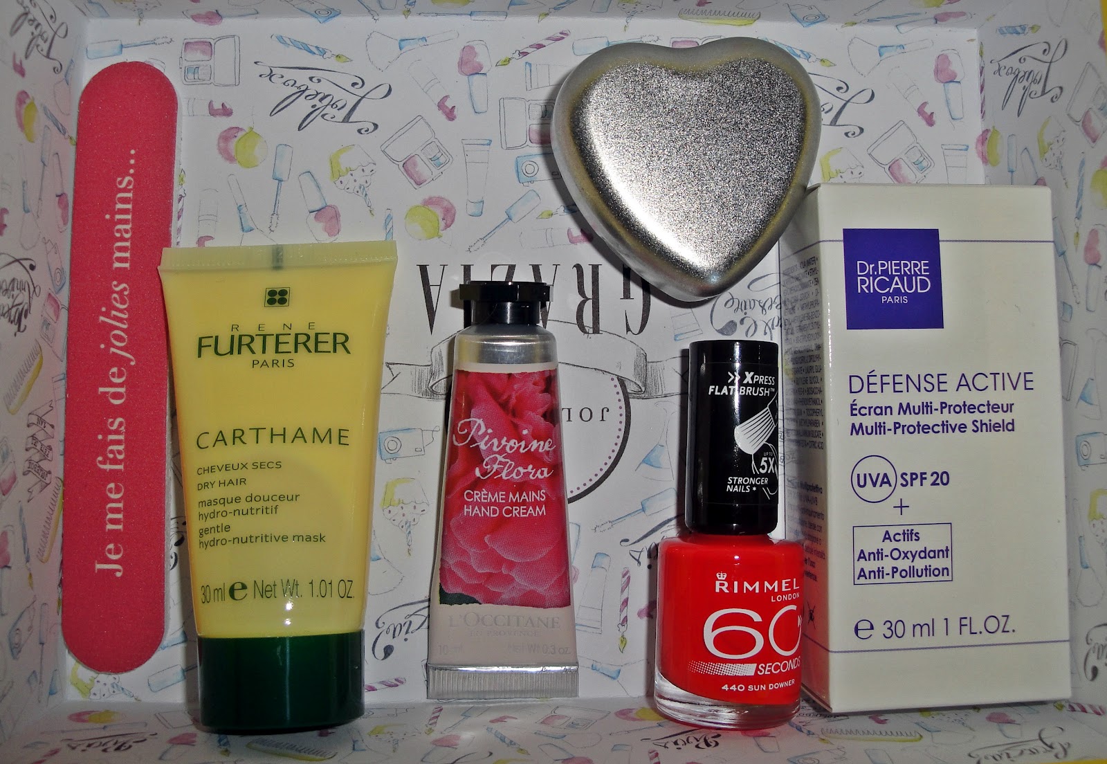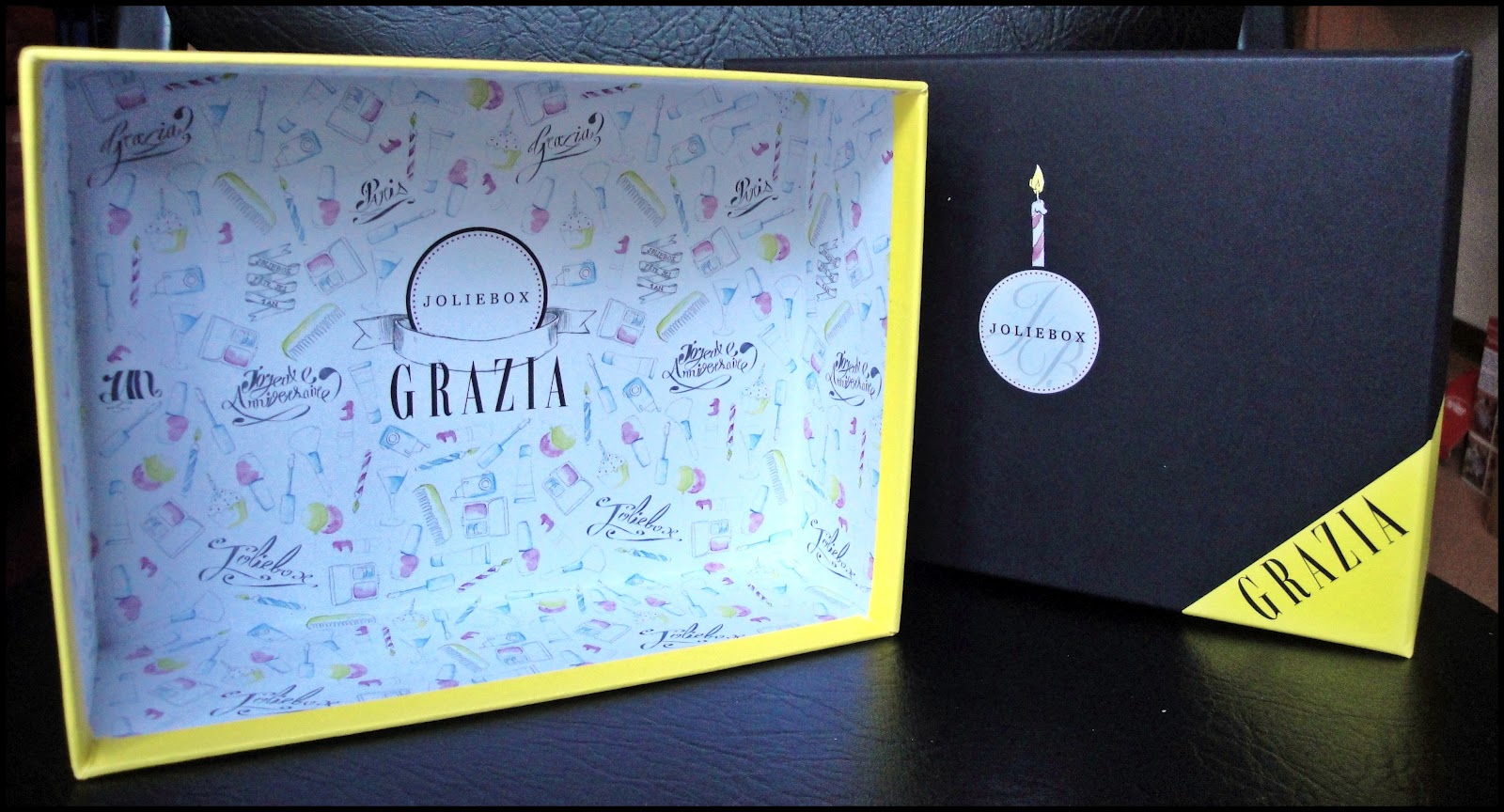 Lo primero que llama mi atención es la caja en sí, engalanada para el evento y súper mona por dentro. Como cada mes, incluyen una tarjetita con una explicación sobre los productos y donde también nos cuentan que para la celebración, este mes se han aliado con Grazia que es una revista de belleza francesa. Es por ello que han incluido como regalo una mini revista Grazia para llevar en el bolso, además de la revistilla de siempre y un panfletillo con dos códigos gracias a los cuales nos podemos descargar gratuitamente canciones de Juliette Katz y Boy.