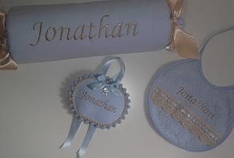 Hoy vengo de nuevo en modo bebé... en esta ocasión con tres cositas para Jonathan. Un caramelito antivuelco, un babero y una medallita para la cuna, el carro o el moisés.