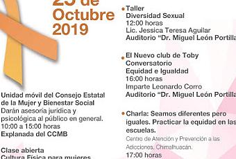 El 25 de octubre inicia con la clase masiva de cultura física para mujeres, a las 9:00 horas, en el talud del área verde del área de talleres; a las 12:00 horas, el taller “Diversidad sexual”, en el Auditorio “Dr. Miguel León Portilla”, con Jessica Teresa Aguilar.