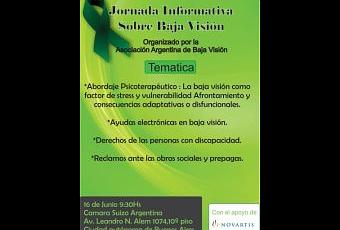 Sábado, 16 de junio de 2012 9:30 - 14:00 CAMARA SUIZA ARGENTINA, LEANDRO N. ALEM 1074 10 PISO CIUDAD AUTONOMA DE BUENOS AIRES A)ABORDAJE PSICOTERAPÉUTICO EN BAJA VISIÓN : ” Conocerse ,aceptarse y superarse “. 1-El déficit visual y sus efectos limitadores: Repercusiones en la vida familiar y sociolaboral. - La baja visión como factor de stress y vulnerabilidad. 2-Ajuste al déficit visual: Variables personales, familiares y sociales. -Importancia de la comunicación del diagnostico y pronostico dado por el oftalmólogo. -Incidencia de la red familiar como apoyo funcional y emocional . -Aspectos psicológicos en baja visión :miedos, ansiedades,sentimientos de angustia .Afrontamiento y consecuencias adaptativas o disfuncionales .Recursos y habilidades sociales. 3-Objetivos de la intervención terapéutica ,modos de abordaje y técnicas. 4-Particularidades en la evaluación e intervención clínica en : -niños y sus padres. -adolescentes. -adultos. -ancianos. B)AYUDAS ELECTRONICAS EN BAJA VISION C)DERECHOS DE LAS PERSONAS CON DISCAPACIDAD. RECLAMO ANTE LAS OBRAS SOCIALES Y PREPAGAS