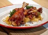 Una ración que destaca por su exquisita combinación de sabores y la ternura del codillo de pato confitado, acompañado de las dos elaboraciones de manzana.
