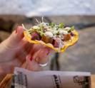 Una propuesta visualmente atractiva y deliciosa. Sobre una base crujiente de talo, se sirve una ración de pato confitado acompañado por la dulzura del membrillo y la intensidad aromática de una mahonesa de trufa, que aporta un toque sofisticado. Un pintxo que eleva la alta cocina a una experiencia accesible para todos. Codillo de pato confitado a las dos manzanas: