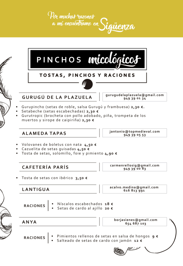 Durante los fines de semana que van desde el 11 de noviembre hasta el 3 de diciembre, periodo de duración de las II Jornadas Micológicas de Sigüenza, en 13 establecimientos de hostelería situados en Sigüenza, Alcuneza y Pelegrina podrán degustarse distintos menús, raciones y pinchos en los cuales las setas serán una parte importante de los mismos.