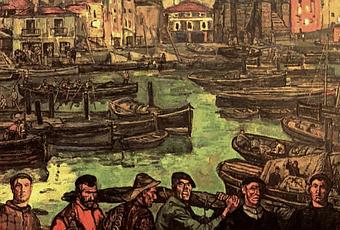 A la caída de la tarde, Puerto Chico presentaba una gran animación; era la hora en que las traineras traían el pescado, y la gente conocida de la ciudad, que volvía del paseo para ir a rezar el rosario a la iglesia de Santa Lucía, se entretenía, para hacer tiempo, viendo llegar a las barcas. Las mujeres de los pescadores se metían las faldas entre las piernas, bajaban con los pies descalzos unas escalerillas de piedra, y con un cuchillo abrían las entrañas a los pescados, y metiéndoles las manos tiraban las tripas al mar; al concluir la limpieza quedaba un gran trozo de agua al lado de las barcas teñido de sangre.