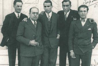 José María de Cossío y Rafael Alberti, en primer plano, acompañados por José Samitier, Carlos Gardel y un amigo no identificado, en Santander el 20 de mayo de 1928, día del primer partido de la final de la