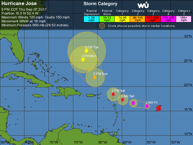 Lo más importante para destacar es que "Jose" seguirá aumentando su intensidad en las siguientes 48 hs, con un movimiento general del Oeste - Noroeste y un leve aumento en su velocidad de avance. También cabe mencionar que el fenómeno natural se convertirá en un poderoso huracán de categoría 4, hacia el día viernes 8 de septiembre, según ha informado El Centro Nacional de Huracanes con sede en Miami.Otra información importante es que "Jose" afectará Antigua y Barbuda, que quedó destruida tras el paso del devastador huracán "Irma". En estas islas se reportan hasta el momento, 9 muertos.