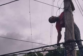 Subió al poste de luz descalzo y las manos descubiertas a realizar una conexión ilegal.