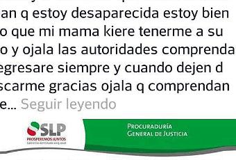 Aclaro vía Facebook que ella va a regresar a su casa siempre y cuando las autoridades dejen de buscarla.
