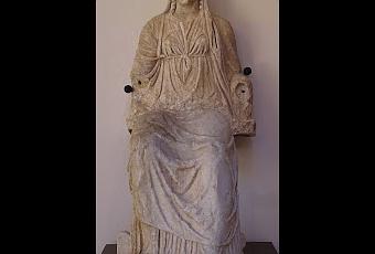 Adquirida a un anticuario cacereño por el Ministerio de Cultura en 1.987, pasaría el 19 de junio de 1.987 a formar parte de los fondos del Museo Arqueológico Provincial de Badajoz una pieza reutilizada en la Llerena del Siglo de Oro como material marmóreo donde labrar un escudo señorial, atribuido al que fuera Contador Mayor de Castilla durante el reinado de los Reyes Católicos y tesorero de la Casa de Contratación de Indias en época de Carlos V, D. Sancho de Paz el Viejo. Procedería ésta presuntamente -y concordando con los datos citados en el contrato de compra, donde se indica la toma de la misma del derribo de un convento gótico llerenense, terminando en manos particulares locales hasta la transacción al negocio cacereño referido- del convento franciscano de San Buenaventura o de San Francisco, cuya sede definitiva fuera concluida en 1.540 bajo el patronazgo del ilustre personaje mencionado, que deseaba fundar allí su capilla-panteón familiar, suprimido el cenobio a raíz de la Real Orden de Exclaustración Eclesiástica de 25 de julio de 1.835, posteriormente desamortizado hasta devenir la desaparición de gran parte del edificio. Cincelados en un blasón cuartelado torreones en sus cuarteles primero y cuarto, tres rombos a sinistra en los dos restantes, el interés principal de la pieza, sin embargo, no recaería en la divisa heráldica expuesta, sino en la propia pieza marmórea en sí, esculpida la obra patronímica en la cara posterior de una antigua escultura, adivinándose por el flanco contrario al escudo lo que debieron ser las piernas de una representación humana sentada, vestida con túnica antepuesta por manto y correspondiente, a todas luces, a una figura femenina sedente, bien algún personaje relevante de la época de fabricación, fechada durante el dominio romano, o inclusive alguna deidad expuesta o adorada en la cercana ciudad de Regina, de donde se supuso que podría ser originaria la obra, sin disponer de detalles sobre su hallazgo pero conociéndose el expolio constante al que era sometido desde antaño el yacimiento latino. La supuesta respuesta a la incógnita, aunque con más de veinte años de tardanza, llegaría finalmente al desenterrarse la escultura que aguardase junto a los templos forenses de la antigua urbe. Alcanzando el metro de altitud, de un tamaño algo superior al natural, se basaba la misma en la representación de la mitad superior o torso de un personaje femenino velado cuya pose, dimensiones representativas antropomorfas, cincelado y naturaleza marmórea originaria de la zona Borba-Estremoz casarían con las características mostradas por la pieza llerenense. Bautizada inicialmente como Dama de Regina, su identificación con la diosa Juno terminaría no sólo planteándose sino, rápidamente, cobrando valor, siendo exhumada de entre los terrenos adyacentes a la parte trasera del templo más oriental de aquéllos identificados como sede de la veneración a la Tríada Capitolina, formada por Júpiter, Juno y Minerva, respaldada la devoción a la diosa del matrimonio en la ciudad bética por un altar dedicado a ésta descubierto en el mismo teatro del municipio.