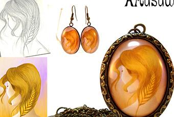 En el proceso creativo de mi bisutería ilustrada, me gusta especialmente idear las ilustraciones para el formato específico que van a tener. Me gusta imaginar cómo quedarán sobre la piel, cómo lucirán unos pendientes ilustrados mezclándose con ligeros mechones de pelo, el toque de color y luz que aportarán al rostro, cómo quedará adornado un escote con esa pequeña obra salida de mis manos.